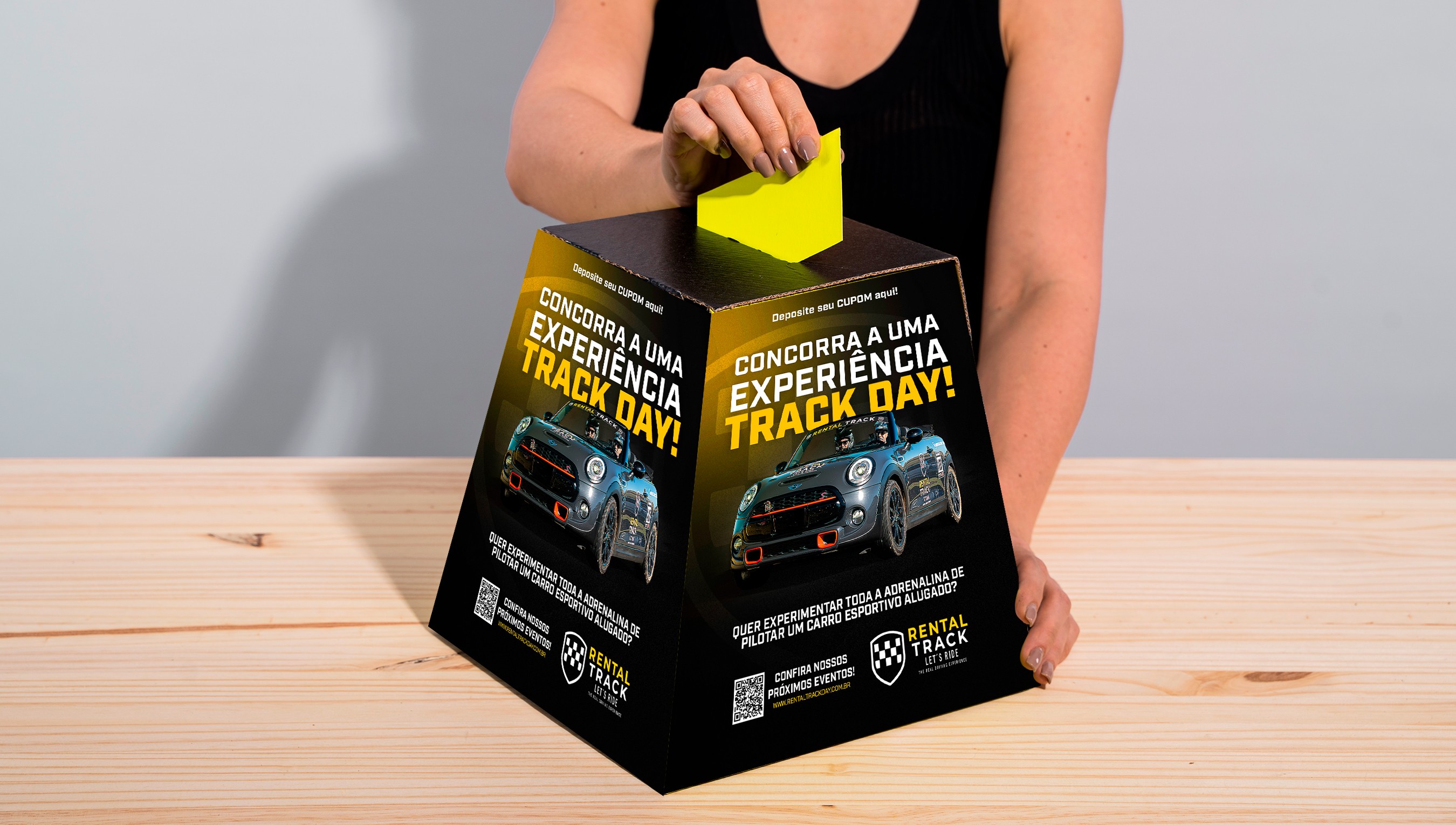 Para impulsionar o engajamento e promover a sua marca, sugerimos a ativação com uma urna de sorteios personalizada, acompanhada de windbanner para reforço da identidade visual. A urna, com design atrativo e comunicação clara (“CONCORRA A UMA EXPERIÊNCIA TRACK DAY!”), incentiva a participação espontânea do público.